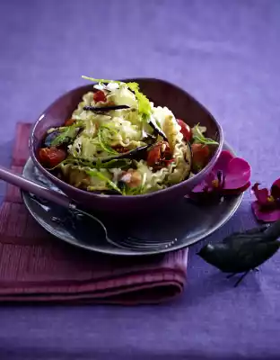 Roast the pine nuts in a pan without fat until golden brown, take them out. Coarsely slice the parmesan. Clean and wash the rocket. Peel and chop garlic. Dab aubergine slices and cut into strips.