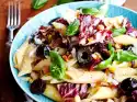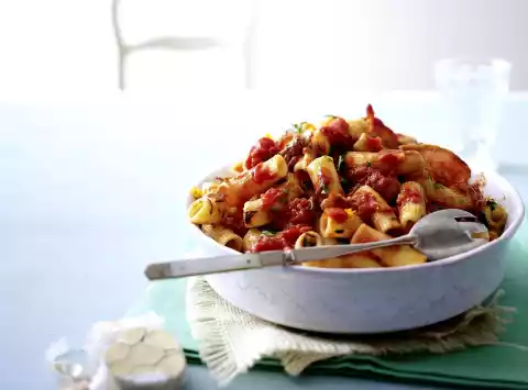 Coarsely crumble the bacon. Wash parsley, shake dry, pluck off leaves and chop finely. Season sauce again. Pour the pasta into a sieve, rinse cold, drain and mix with the tomato-orange sauce in the pan.