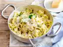 Fry the bacon in a large coated pan without fat until crispy. Take out and let drain on kitchen paper. Add the noodles to boiling salted water and cook according to the instructions on the packet.
