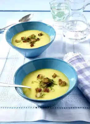 Add the potatoes and goat's cheese to the soup, mash and bring to the boil again. Season to taste with salt and pepper. Wash the turnip leaves, cut into thin strips, blanch in boiling salted water for about 1 minute and rinse with cold water.