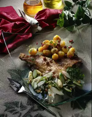Serve with bacon potatoes and asparagus salad. Sprinkle with remaining chives and serve garnished with parsley.