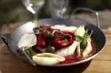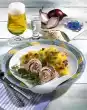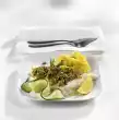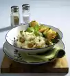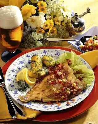 Wash the potatoes and cook in boiling salted water for about 20 minutes. Clean and wash the fish, dab dry and sprinkle with lemon juice. Cut bacon into small cubes. Clean and wash spring onions and cut them into rings. Wash, quarter, seed and dice the tomatoes. Drain bacon in a pan, add spring onions and tomatoes and fry while turning. Season with salt and pepper and take out.