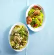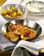 Heat a tablespoon of oil in a saucepan. Fry the chorizo for two minutes. Add the onions, tomatoes and garlic and fry for four more minutes. Pour in the broth and add the pasta. Cook the pasta over medium heat for twelve minutes. Wash the meat and dab dry. Heat two tablespoons of oil in a coated pan. Season the meat with salt and pepper and fry in the pan for ten minutes until golden brown all around. Wash the marjoram, dab dry and remove coarse stalks. Finely chop the marjoram.