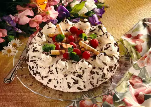 Also fold in raisins and cherries. Place the edge of the springform pan around the sponge cake base and spread the parfait mixture on top. Let it freeze for at least 5-6 hours. Wrap the edge of the springform pan with a warm tea towel and remove the cake.