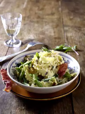 Cook the pasta in boiling salted water according to the instructions on the packet. Soak the porcini in water. Wash and clean the beans and cook in boiling water for about 12 minutes. Drain and let drain. Fry ham in a pan without fat until crispy and drain on kitchen paper