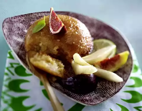 Mix fruit and lime juice carefully. Arrange the pudding with fruit salad on plates, decorate with a slice of lime and mint leaves