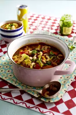Pour the pasta into a sieve, rinse cold and drain briefly. Then add them to the soup together with beans and basil. Bring to the boil again and season to taste with salt, pepper and sugar. Serve the minestrone with a dash of pesto and the soup is ready to eat.