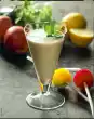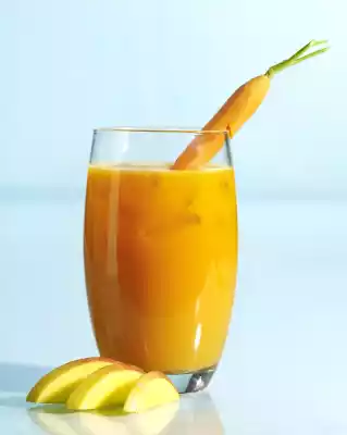 Cut the mango pulp into large pieces. Put pineapple juice, carrot juice, honey and lime juice into a mixing cup. Add the mango and puree with a chopping stick. Peel the mini carrot and cut in at the side.