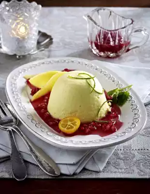 Add the seeds, let it cool down. Turn out cream and serve with sauce and mango. Decorate.