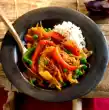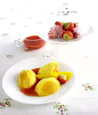Wash, clean and halve 250 g strawberries. Puree with 1-2 tbsp sugar and 2 tbsp lemon juice. Use 2 tablespoons to cut the flan into cams and serve with the sauce. Decorate with the rest of the mango in wedges and strawberries, dust with icing sugar.