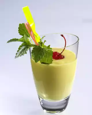 Pour the mango and juice into a tall mixing bowl and puree finely with a blender. Mix lemon juice, yoghurt, sugar and vanilla sugar. Stir in pureed mangoes and fill into four glasses. Serve well chilled, decorated as desired with lemon balm and cocktail cherries