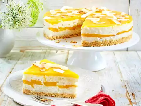Melt the butter. Put the rusks in a freezer bag and crumble them finely with a rolling pin. Mix butter, rusk crumbs and grated coconut well. Brush the bottom of a springform pan (26 cm Ø) with oil. Add the crumb mixture and press it down to a firm base. Chill for at least 30 minutes.