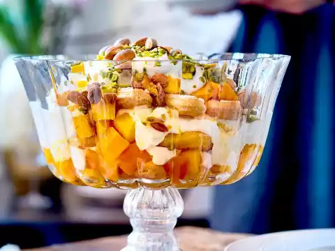 Cut the biscuits in half, alternate layers of mango and cream in a bowl. Roast the almonds, add the pistachios and the rest of the orange grated on the trifle.