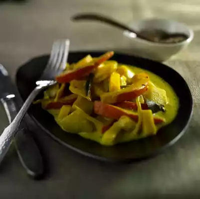 Add the pumpkin and sweat for 1 minute. Add coconut milk and potatoes, bring to the boil and simmer for about 5 minutes. Season to taste with salt. Cut mango pulp from the stone, peel and cut into short sticks.