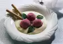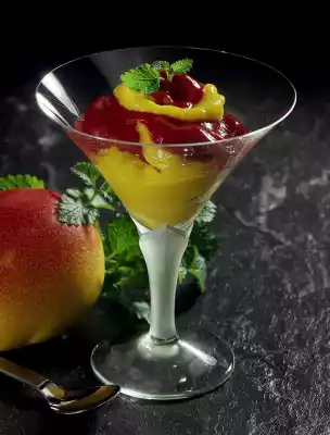 Stir vigorously with a whisk about every half hour. It is best to pre-freeze glasses. Layer mango and raspberry sorbet alternately. Decorate with lemon balm