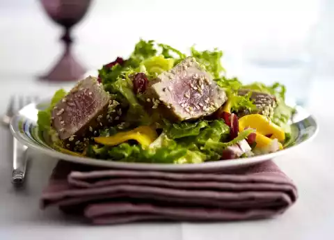 Roll fish in sesame seeds. Cut into slices and arrange on the salad. Add flatbread.
