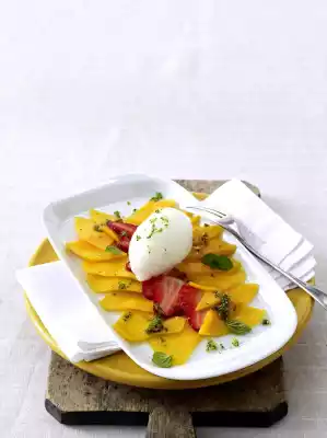Cut the mango from the stone and peel it. Cut the fruit flesh diagonally into thin slices. Wash and clean the strawberries and cut them into thin slices. Wash mint, dab dry and pluck leaves from the stalks.