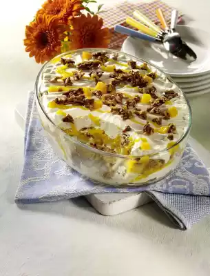 Put half of the biscuits into an ovenproof dish (approx. 2.5 litres capacity). Mix orange juice and liqueur. Sprinkle biscuits with about 1/2 of the liquid, spread half of the cream on top. Spread fruit puree, up to 4 tablespoons, on top. Cover with remaining biscuits, drizzle with liqueur-juice mixture, spread the remaining cream on top. Chill for about 3 hours. Heat 3 tablespoons of sugar and almond slivers in a pan until the sugar melts and caramelises. Spread the brittle on baking paper to cool down. At first, break the brittle into small pieces.