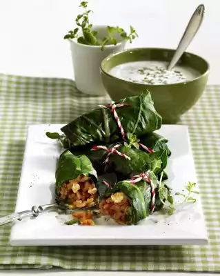 Cook the chard leaves in boiling salted water for about 2 minutes. Remove and rinse in cold water. Melt the fat. Dust with flour and sweat on. Add 300 ml stock and milk while stirring. Bring to the boil and simmer for about 2 minutes. Season to taste with salt and pepper. Wash, clean, quarter and seed the tomatoes. Cut the flesh into small cubes. Crumble the feta cheese and fold into the rice with the tomatoes. Place 1-2 tablespoons of rice on each narrow side of the leaves, leaving a rim of about 1 cm wide. Fold the long sides over to the middle. Roll up from the narrow side and fix with kitchen string.