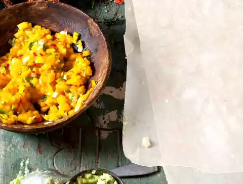 Peel the mango. Cut the flesh first from the stone and then into fine cubes. Clean, wash and finely chop the spring onion. Pepperoni clean, lengthwise halve, core, wash and chop finely.