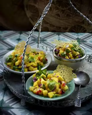 of dough flat, fry over a very low heat for 6-8 minutes until the dough is crispy on the underside. Turn and fry for another 5-6 minutes until crispy. Remove the finished bread wafers and let them drip off on kitchen paper. Break into smaller pieces as desired. Season the mango salsa again and serve with the bread waffles