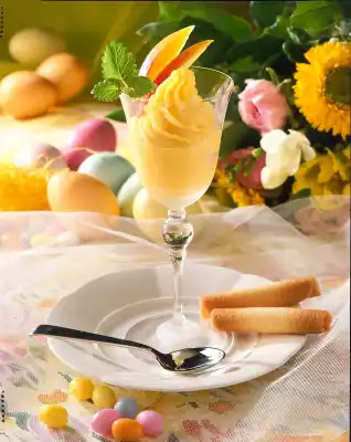 Cut the vanilla pod lengthwise and scrape the pulp into a pot. Add the vanilla pod, cinnamon stick, sugar and 150 ml water, and boil down like a syrup. Leave to cool and pass through a fine sieve. Meanwhile peel the mangos and cut the flesh from the stone. Weigh 250 g of flesh. Mix mango and lime juice, puree, add sugar syrup bit by bit. Place the mango puree in a wide stainless steel bowl in the freezer and freeze in approx. 4 hours. Stir vigorously about every 30 minutes to give the sorbet a smooth consistency. Pour the sorbet into a piping bag with star-shaped spout and squirt into pre-cooled glasses. Garnish with mango slices and lemon balm as desired