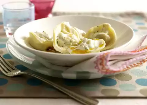Press the tips of the respective long sides together to form a circle. Cook Manti in boiling salted water for about 5 minutes. In the meantime peel garlic and press it through a garlic press. Mix yoghurt, milk and garlic. Season with salt. Melt butter, stir in 1 teaspoon of paprika. Arrange manti and yoghurt sauce on plates. Sprinkle with herbs and sprinkle with paprika butter