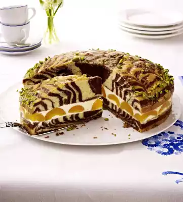 Cut the cake in half horizontally. Place a cake ring or the springform pan rim around the bottom cake base. Spread 1/4 of the cream on the base. Cover with apricot halves. Add the rest of the cream and smooth it down. Put the upper half of the cake on the cream and chill the cake for at least 4 hours