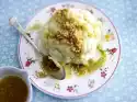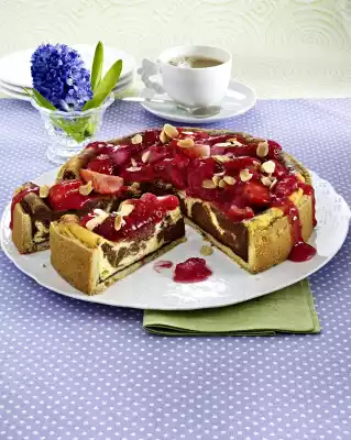 Marble with a fork. Bake in the preheated oven (electric cooker: 175 °C/ convection oven: 150 °C/ gas: level 2) for 60-70 minutes. Remove the cake and let it cool down. Clean, wash and cut the rhubarb into pieces. Bring apple juice and 2 tbsp. sugar to the boil, add rhubarb and simmer for about 5 minutes. Stir red fruit jelly powder with a little water until smooth, thicken rhubarb with it, bring to the boil again. Pour into a bowl and let cool off. Wash, clean and quarter the strawberries. Fold into the lukewarm rhubarb. Let it cool down. Lightly roast the flaked almonds in a pan without fat, remove. Pour compote onto the cold cake, sprinkle with almond flakes