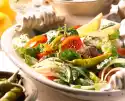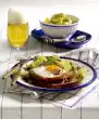 Remove the eggs from the stock, peel them carefully. Mix salad, ham, tomatoes and vinaigrette, season again. Arrange lettuce and eggs on plates