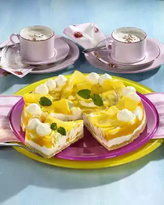 Spread the rest of the yoghurt cream on top, add the remaining mango puree evenly and marble again with a fork. Chill the cake for about 3 hours. Whip 100 g cream until stiff, pour in 1 teaspoon of sugar. Remove the cake from the tin and place on a cake plate. Pour the cream into a piping bag with a perforated spout and decorate the cake with it. Serve decorated with thin fresh mango slices and lemon balm