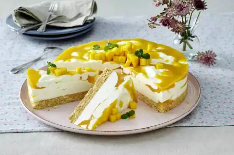 Put the cake in a cool place for at least 4 hours. Cut the mango off the stone. Peel and chop the flesh. Remove the cake from the tin, place on a cake plate and decorate with mango and mint.