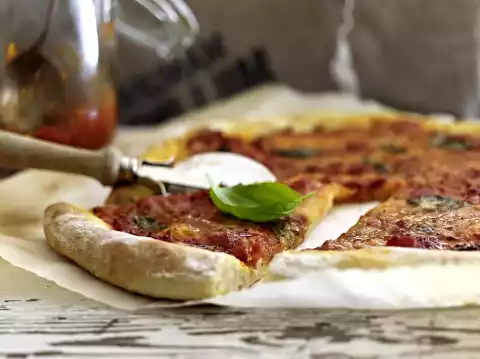 Prepare pizza dough and tomato sauce. Cut mozzarella into slices. Wash the basil, shake dry and pluck the leaves.