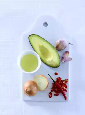Press the garlic with the bottom of the pot so that the skin bursts open. Wash and clean the chillies and cut into rings. Peel and finely chop the onion. Remove the avocado from the skin. Dice avocado. Mix lime juice with garlic, chilli, avocado and onion