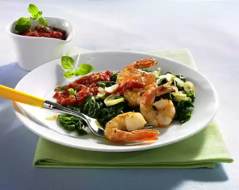 Season spinach with salt, pepper and nutmeg. Arrange prawns on the spinach, add tomato sauce and garnish with remaining oregano.