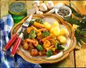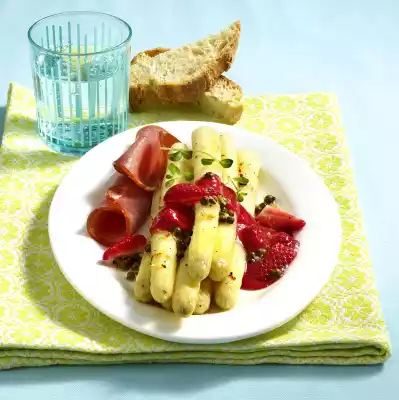 Clean and wash the strawberries, quarter about 1/3 of the strawberries and put aside. Puree remaining strawberries with vinegar, season with salt and pepper. Pour strawberry sauce over the asparagus, spread strawberry quarters on top. Serve with salmon ham and bread. Garnish with marjoram