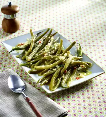 Wash and clean the beans. Cook the beans in boiling salted water for 10-12 minutes. Peel and finely dice shallots. Mix vinegar, mustard and 8 tablespoons bean water. Fold in the oil. Wash and halve the chilli pepper.