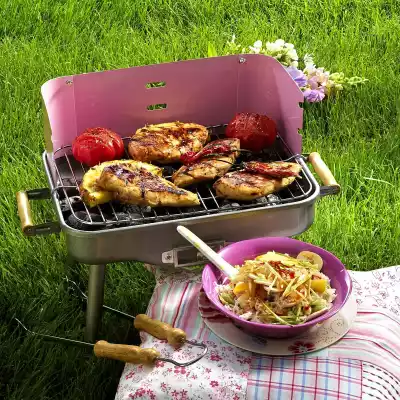 Mix sweet-sour sauce, coriander, vinegar and oil. Season with salt, pepper and sugar. Mix the salad ingredients and sauce, let it stand for a while and season again. Grill the chicken fillets for about 12 minutes while turning. If you like it spicy, cover the fillets with pepperoni. Grill the pineapple slices for about 5 minutes while turning