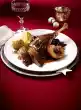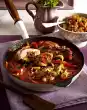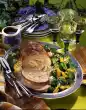 Add stock and tomato wedges and steam for three minutes. Remove the remaining thyme leaves and fold them in. Season to taste with salt and pepper. Cut the chicken meat open and serve with halved lemon slices and the sauce.