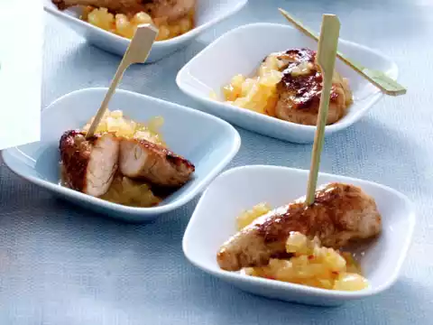 Add the chili sauce and pineapple. Heat 1 tablespoon of oil in a frying pan. Fry the meat at medium heat in portions for about 5 minutes, turning. Season with salt. Arrange salsa and meat in small bowls.