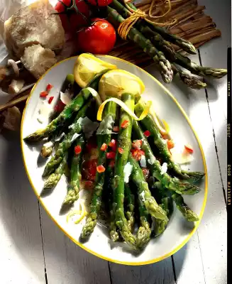Boil up about 2 litres of salted water. Cut the ends (approx. 2 cm) off the asparagus. Wash the asparagus, add to boiling water and cook over a low heat for 10-15 minutes. Wash, clean, quarter and seed the tomato. Cut the flesh into small cubes. Mix vinegar, lemon juice, sugar, salt and lemon pepper.