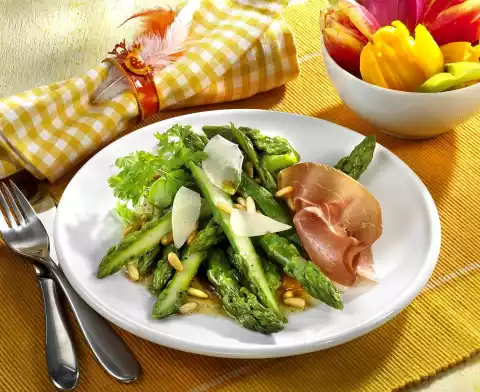 Fold in olive oil. Add asparagus to the marinade. Let stand for about 15 minutes. In the meantime, use an asparagus peeler to peel the parmesan from the piece. Arrange the asparagus on four plates. Spread pine nuts and Parmesan cheese evenly on top. Serve garnished with a slice of ham and chervil