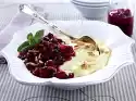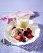 Fill apricot halves with cranberries. Serve with the fruit salad on dessert plates. If necessary, chop the pistachios coarsely and sprinkle over them. Decorate with mint leaves and biscuits as desired