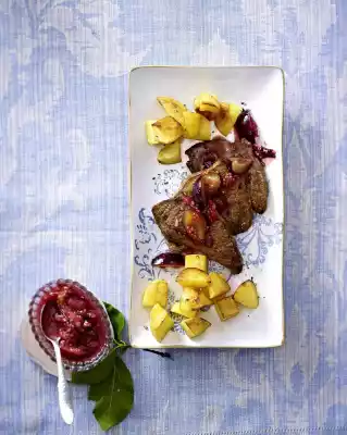 Remove meat from the marinade and pat dry. Heat 2 tablespoons of oil in a frying pan. Fry the meat in it in portions for about 4 minutes each, turning. Arrange schnitzel, potatoes and chutney