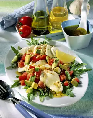 Drain the mozzarella and cut into slices. Peel and chop the garlic. Mix vinegar, mustard, honey, garlic, some salt and pepper. Pour over the mozzarella slices and leave to marinate for at least 1/2 hour. In the meantime wash the tomatoes, dab dry and cut into cubes. Halve the avocado and remove the stone. Remove the flesh from the skin, dice and sprinkle with 2 tablespoons of lemon juice.