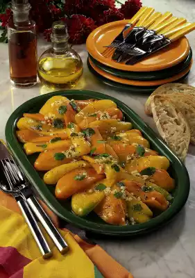Mix with vinegar, salt and pepper and add the oil. Wash the marjoram, dab dry, pluck the leaves from the stalks and add to the marinade. Arrange the sliced peppers on a plate and pour the marinade over them. Leave to stand for about 2 hours. Italian white bread tastes good with it