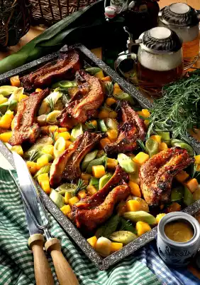 Add some pumpkin stock and sprinkle mustard seeds over it. Season vegetables to taste and serve with the ribs. Serve with fresh farmhouse bread.