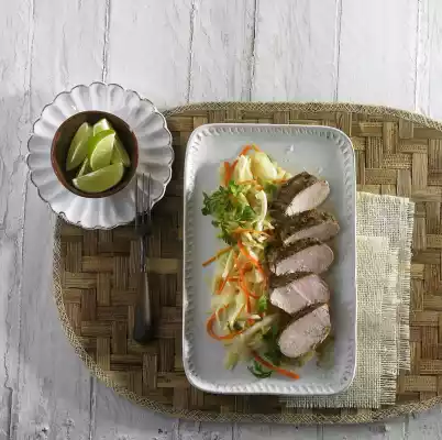 Add everything with vinegar, juice of 1 lime, sugar and 2 tablespoons of oil to the cabbage. Mix well and let it stand for about 15 minutes. Wash the coriander and shake dry. Pluck the leaves and chop them roughly. Season salad with salt and pepper, fold in coriander. Fry the fillets in 1 tablespoon of hot oil over a high heat until they are brown all around. Place on a baking tray. Bake in a preheated oven (electric cooker: 200 °C/ convection oven: 175 °C/ gas: level 3) for approx. 12 minutes. Remove and wrap in aluminium foil. Let rest for about 5 minutes. Cut the meat into slices, season with coarse salt and serve with cabbage salad