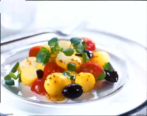 Season. Wash the watercress and pluck the roots. Drain the cress. Wash, clean and halve the tomatoes. Mix olives, tomatoes and watercress with the potatoes. Season and arrange again if necessary.