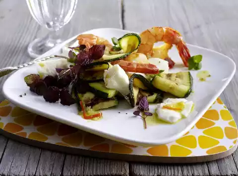 Reheat the frying pan. Place the shrimps with the marinade in the pan and fry for 2-3 minutes, turning. Cut the mozzarella into pieces. Add the zucchini and lemon juice to the prawns, flip through and season with salt and pepper.